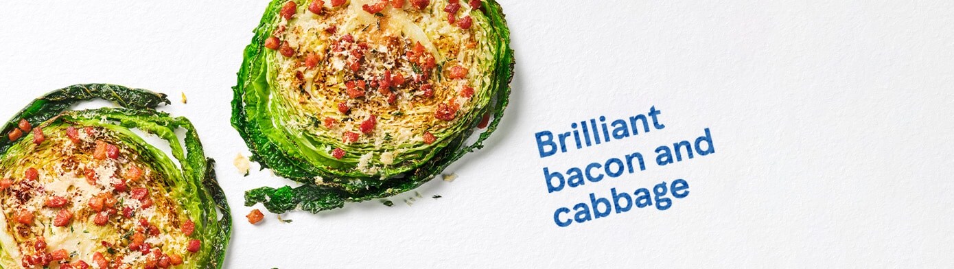1. Preheat the oven to gas 6, 200°C, fan 180°C. Cut 4 thick slices (about 1-1½cm) from the middle of a cabbage. Leave the core attached to hold the steaks together.