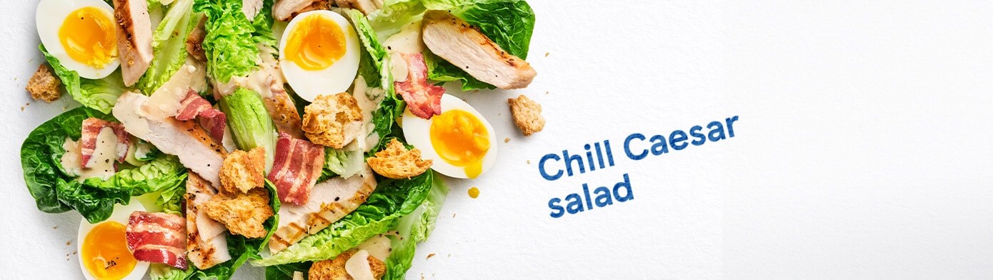 - Pile 3 sweet gem lettuce leaves onto a serving platter. Peel and slice each egg into 6, then top the lettuce with chicken, eggs and ciabatta pieces. Break the pancetta into shards and add this to the salad along with 45g Parmesan shavings. Drizzle over some Caesar dressing and finish with freshly ground black pepper.