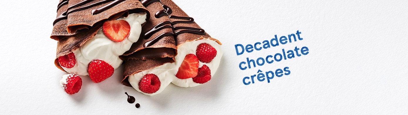 1. To make the pancakes, sift 100g plain flour and 15g cocoa into a bowl, add 1 egg and 1 egg yolk, then gradually whisk in 250ml milk until smooth. Leave to stand for 15 minutes.