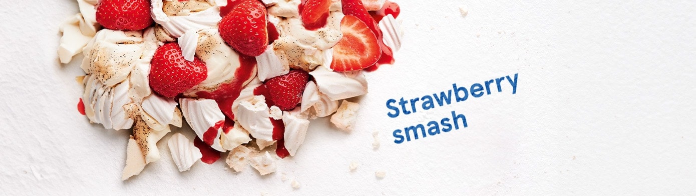 - When the meringue is hardened and cooled, break it into pieces in a large bowl. Add the vanilla yogurt and strawberries, along with any juice from the cut strawberries that may have collected.