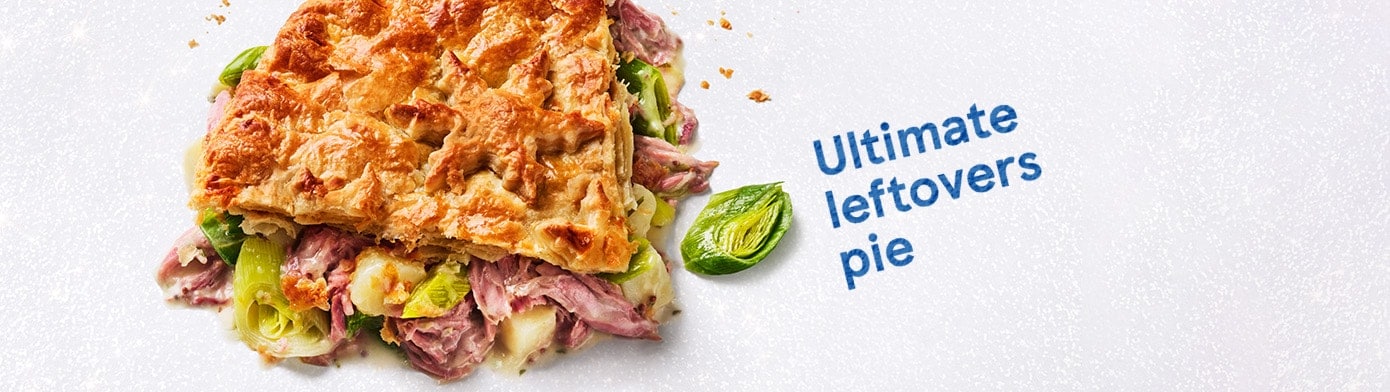 - Unroll pastry and cover the pie; trim the overhanging pastry. Pierce the centre of the pastry with the tip of a knife and brush with 1 beaten egg. Re–roll the trimmings and cut out festive shapes to decorate the pie, if you like; brush with egg. Bake for 25-30 minutes until the pastry is crisp and golden.