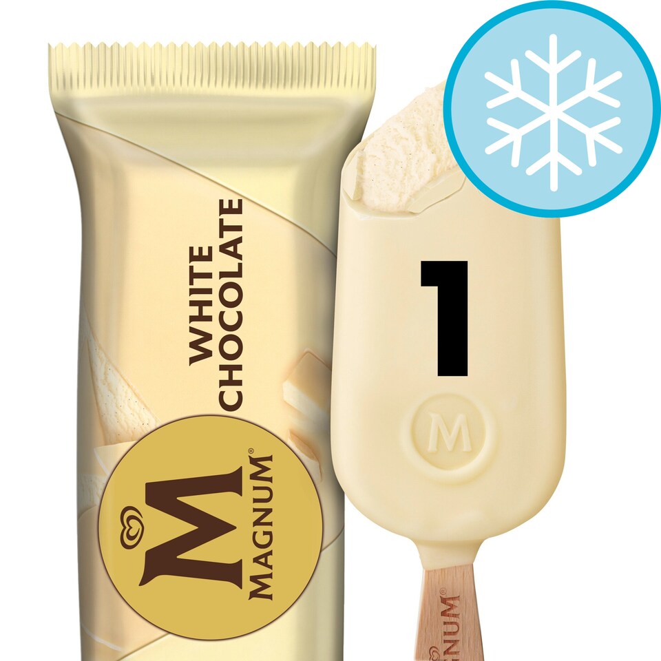 - Magnum White Chocolate Ice Cream Stick - experience the true pleasure and superior taste of velvety smooth ice cream wrapped in cracking Magnum white chocolate