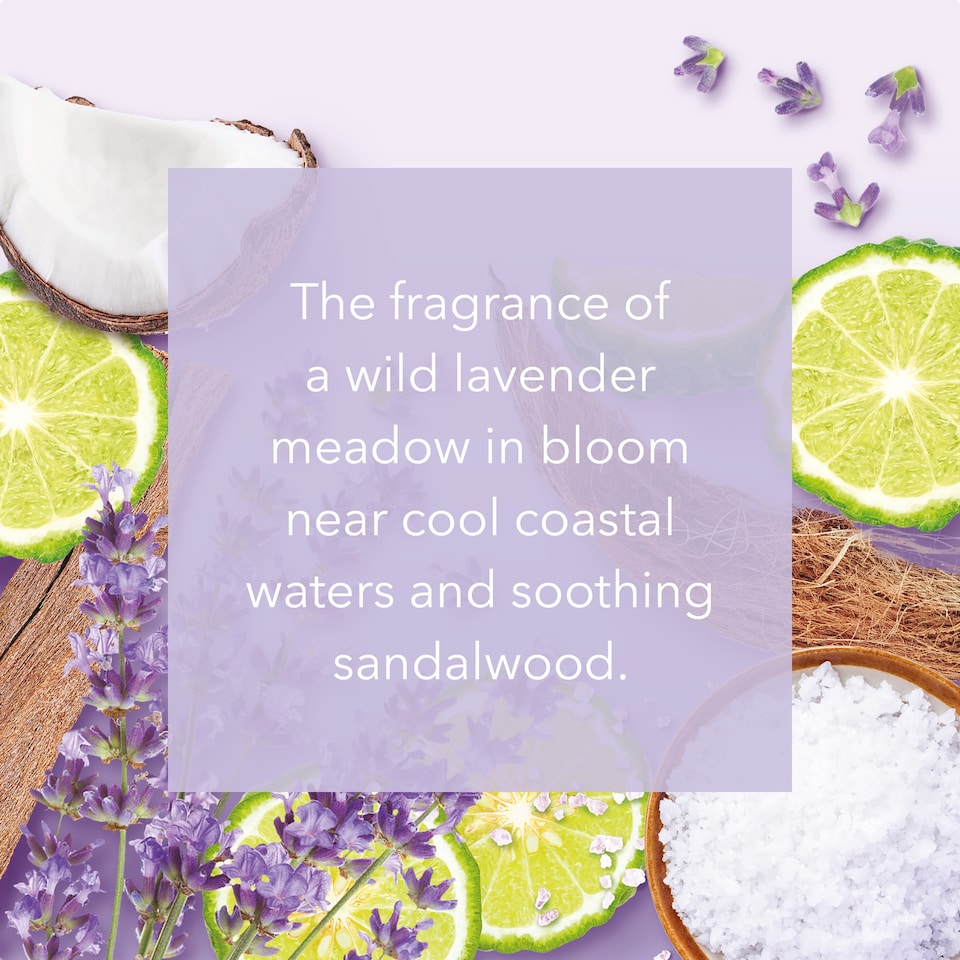 - The fragrance of a wild lavender meadow in bloom near cool coastal waters and soothing sandalwood