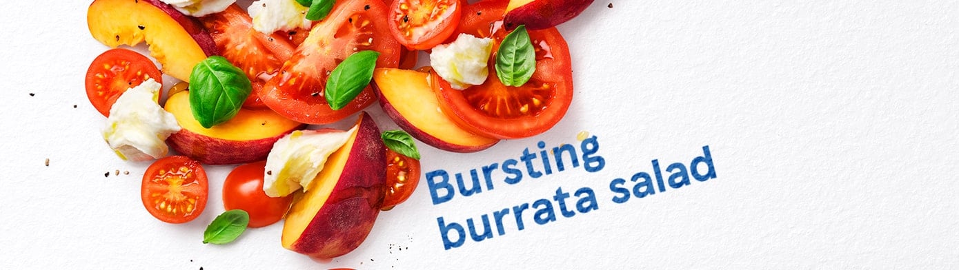 - In a large salad bowl, gently mix together 400g sliced Tesco Finest vine tomatoes, 250g halved Piccobella cherry tomatoes, and 3 ripe peaches cut into wedges. Transfer to a platter and add 250g Tesco Finest Italian burrata, drained and torn into pieces.